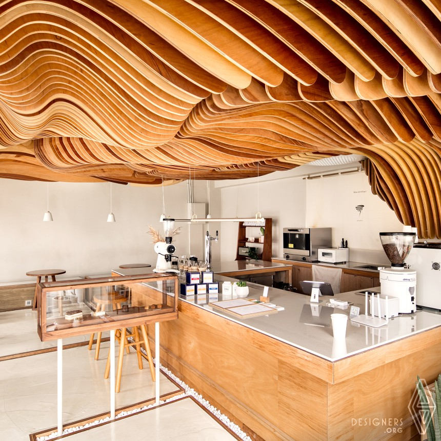This small warm wooden feel cafe located on the corner of crossroad within a quiet neighborhood. The centralized open-preparation zone makes a clean and extensive experience of barista's performance to visitors everywhere that bar seat or table seat in a cafe. The ceiling object called "Shading tree" starts from the backside of the preparation zone, and it covers the customer zone to makes the entire atmosphere of this cafe. It gives an unusual spatial effect to visitors and also become a medium for people who want to be lost in thought with flavorous coffee.