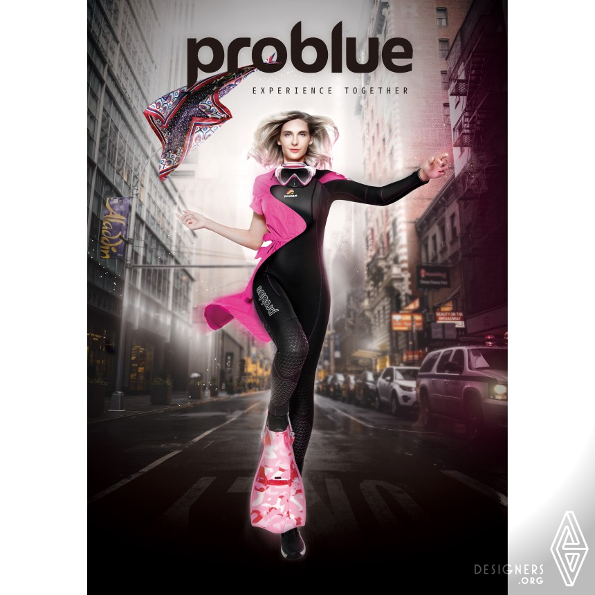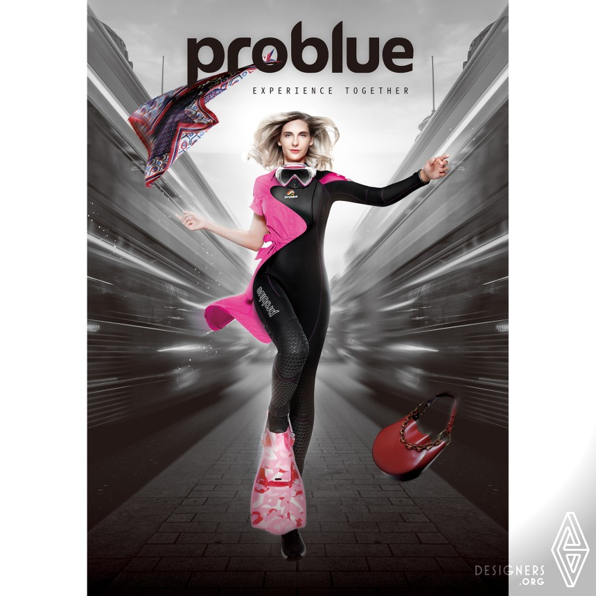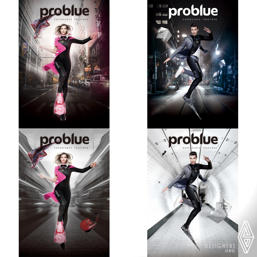 The concept of the posters related to Problue brand essence as diving and live. The transition process of clothes in style and diving suit on the same model emphasized the merge of diving and live. As the brand colors, gray blue was applied to gentlemen for elegance and the red was to the lady for charming. The camouflage fins emphasized the fact urban life was as full of movement as in nature. Different contrast were made on purpose to enhance visual experience, for example, fast and still, daily wear and diving suit, smooth and sharp, hero look and elegance.