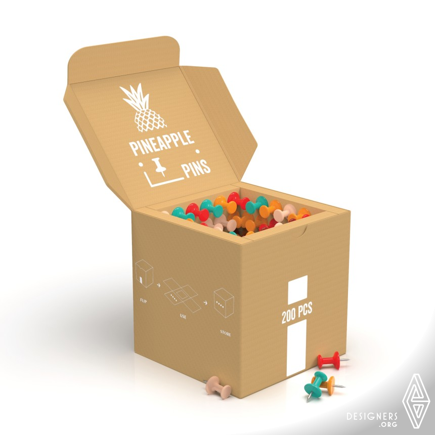 Pineapple Pins is a versatile packaging solution that is offbeat and user-centric in approach. The idea was to come up with a design solution that made the cycle of using push pins easy, versatile and efficient. Ideating a versatile functionality within eco-friendly packaging and keeping it minimal was the aim. The varied stages in the use of the package effectively suffice the cycle of picking, using, and storing push pins. The packaging solution is ergonomic, convenient, eco-friendly, user-friendly, safe from kids, can be used multiple times, and is hassle-free.