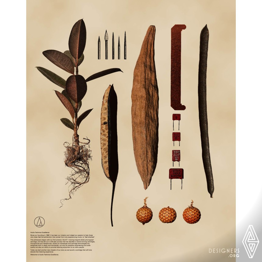 Sound is there for humans, just like natural vegetation. As indispensable for human beings as well as nature The grass and seeds that are natural products and the precise mechanical parts that make up the music product are displayed side by side. In addition, This all works were composed using the photographs taken. Because it is important that this brand's products are analogue The texture of the picture was created with reference to an old handwritten vegetation picture book.