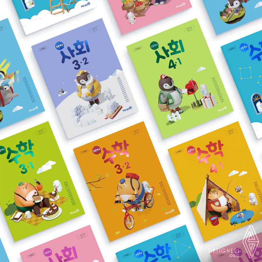Miraen elementary school mathematics and social studies textbook covers express the images of daily situation of people's lives as in connection with the subject. Characters are illustrated to tell the stories of learning contents in a fun way so that students can have an easier approach to textbooks which may be a bit dry at times. The fun characters that match the eye level stimulate the students' curiosity and they make students empathize with the characters to increase intimacy with the textbooks.