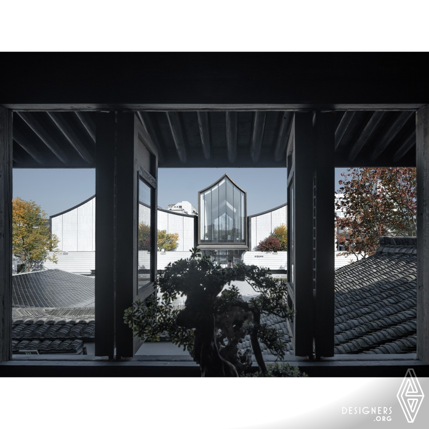 Xu Wei Art Museum is located on the north side of Kaiyuan Lane and Houguan Lane beside Green Vine Study in Shaoxing City. The design team makes use of the naturally undulating topography facing the square to lessen the impact of the building volume on the surroundings. In addition, a portion of space is set underground, and a boardwalk on the roof connects the interior and the outdoors, creating a separate network of public spaces that incorporate tourists' movements into the picturesque architectural scene.