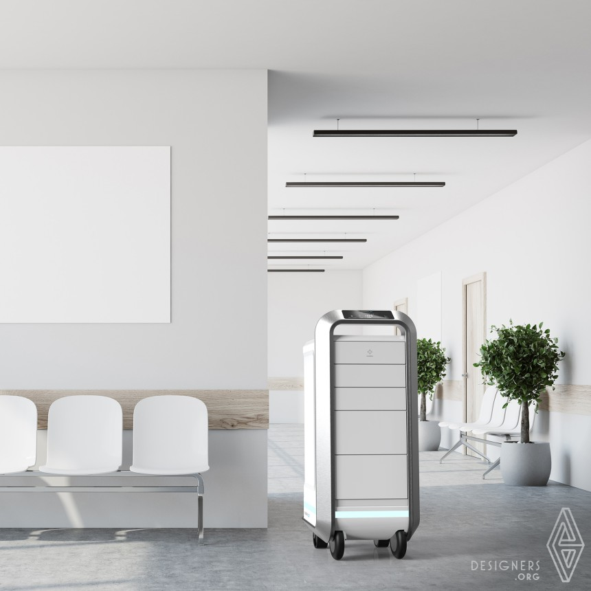 Autonomous navigation robot for hospital logistics. It’s a product-service system to perform safe efficient deliveries, decreasing the health professional’s chances of being exposed to get sick, restraining pandemic diseases between hospital staff and patients (COVID-19 or H1N1). The design helps to handle hospital deliveries with easy access and safety, using uncomplicated user interaction through the friendly technology. The robotic units have the ability to move autonomously into indoor environment and have synchronized flow with similar units, being able to robot team collaborative work.