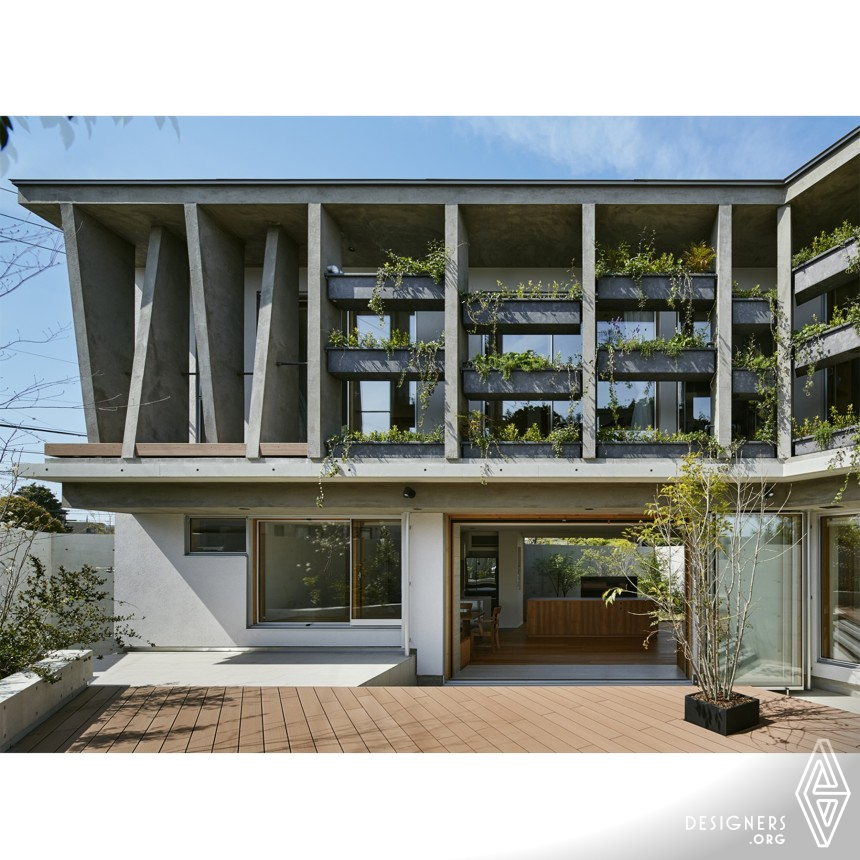 The house is extend green in both planar and stereoscopic, that create a good environment for both residents and the city. In the sunny Asian region, Breeze Soleil using this green is a very effective way of thinking. Not only the function of the sunshade in the summer but also protection of privacy, avoidance from the street noise and cooling effect by automatic irrigation can be obtained.
