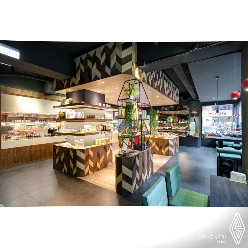 While meeting with the lady owned this German Bakery in Taipei City, D.More Design Studio was inspired by both fairy tale and concise impressions of Germany. Representing the image of Black Forest, Schwarzwald, from where the German secret recipe was originated, they made all background in dark and settled two wooden cabins filled with breads in the center forest surrounded by the iconic Bauhaus chairs with red berry like lights hanging above. The timber frame pattern of traditional German houses were converted into the steel frame shelves, and the storefront facade.