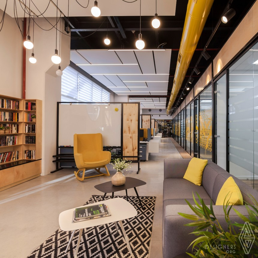 This space designed for a company manufacturing items for private and/or military market, combining hi and low-tech technology. Raw construction materials and elements were chosen for an industrial design theme, since the office level overlooks the manufacturing area. Office is divided into an open space teamwork area with private rooms designated for management, conference meetings, display center and assembly room. The facade in the main space is made of glass partitions designed with individualized graphics. Design language includes exposed ceiling and concrete floor. The aim was to build a