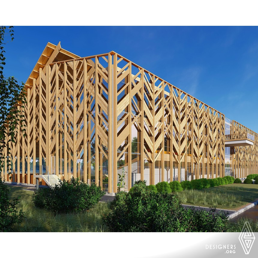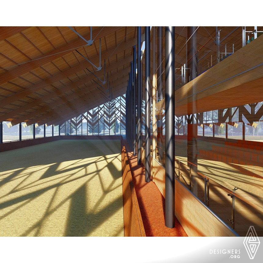 Equestrian pavilion is a part of the newly creating equestrian center. Object is located on the cultural heritage and protected by cultural area of the historical ensemble of the exhibition. Main architectural concept is the exclusion of massive capital walls in favor of transparent wooden lace elements. The main motive of the facade ornament is a stylized rhythmic pattern in the form of wheat ears or oat. Thin metal columns almost imperceptibly support the light rays of the glued wooden roof, which lifted up, with the completion in the form of a stylized silhouette of the horse's head.