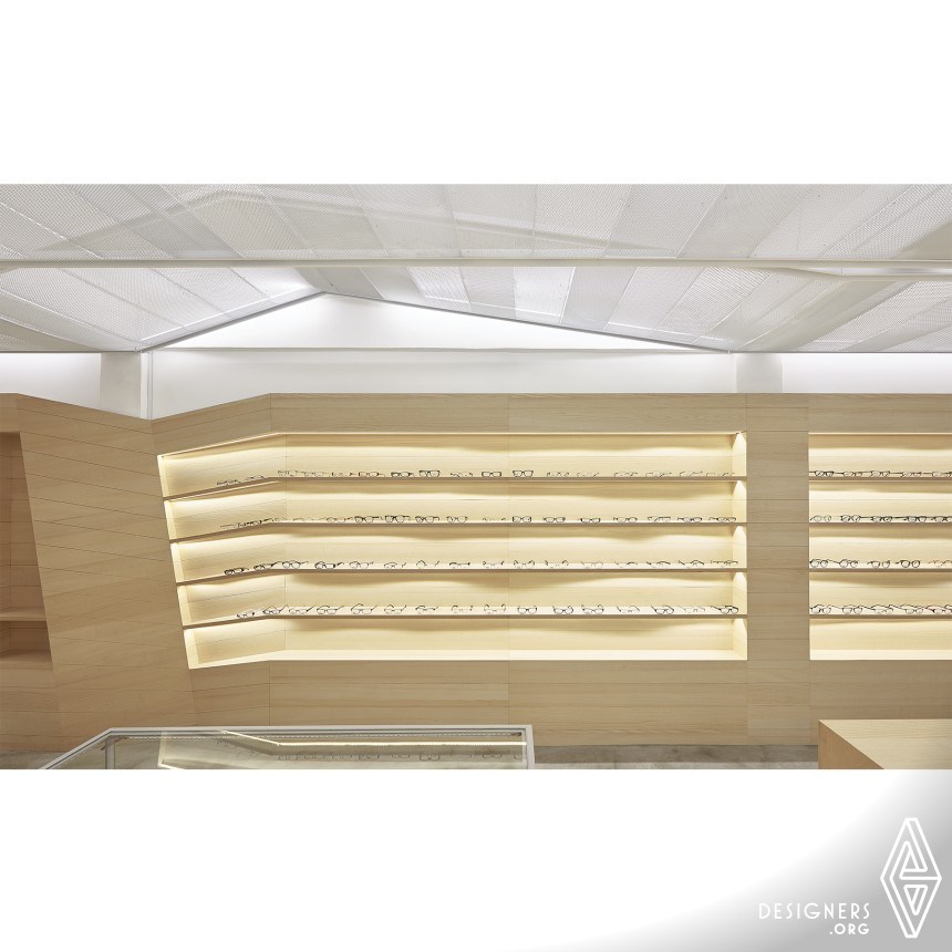 The glasses shop tries to create a unique space . by making good use of expanded mesh with different sizes of holes through recombination and layering and applying them from architectural wall to interior ceiling, the characteristic of concave lens is shown- different effects of clearance and vagueness. With the application of concave lens with the angle variety, twisted and tilted effects of images are presented on ceiling design and display cabinetry. The property of convex lens, which changes the sizes of objects at will, is expressed on exhibition wall.